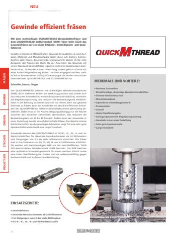 NEUFR%u00c4SEN BOHREN DREHEN STECHEN INDUSTRIENGewinde effizient fr%u00e4senMit dem mehrreihigen QUICKMTHREAD-Wendeplattenfr%u00e4ser und dem SOLIDMTHREAD Vollhartmetall (VHM)-Fr%u00e4ser hebt ISCAR das Gewindefr%u00e4sen auf ein neues Effizienz-, Vielseitigkeits- und Qualit%u00e4tslevel.Es gibt verschiedene M%u00f6glichkeiten, Gewinde herzustellen. Je nach Aufgabe, Material und Maschinenpark lassen diese sich drehen, bohren, stechen oder fr%u00e4sen. Besonders die letztgenannte Option ist f%u00fcr viele Zerspaner der Prozess der Wahl. Da der Anwender das Gewinde mit einem Standard-Gewindefr%u00e4ser jedoch in mehreren Zustellungen bearbeiten muss, dauert der Prozess relativ lang, zudem geht er oftmals mit einer hohen Biegebelastung einher. Um dem entgegenzuwirken, stellt ISCAR im Rahmen seiner LOGIQUICK-Kampagne die beiden innovativen Gewindefr%u00e4ser QUICKMTHREAD und SOLIDMTHREAD vor.Schneller, besser, l%u00e4ngerDer QUICKMTHREAD arbeitet mit dreieckigen Wendeschneidplatten (WSP), die in mehreren Reihen am Werkzeug platziert sind. Dieser Aufbau reduziert Schnittkr%u00e4fte, erh%u00f6ht die dynamische Stabilit%u00e4t, minimiert die Biegebeanspruchung und reduziert die Bearbeitungszeit erheblich.Statt in die Bohrung zu fahren und mit nur einem Zahn das gesamte Gewinde zu fr%u00e4sen, kann der Anwender mit den drei effektiven Schneiden des QUICKMTHREAD mehrere Gewindeabschnitte gleichzeitig bearbeiten. Dabei muss er im Prozess steigungsabh%u00e4ngig nur die R%u00e4ume zwischen den einzelnen Zahnreihen %u00fcberbr%u00fccken. Das reduziert die Bearbeitungszeit um 50 bis 80 Prozent. Zudem kann der Anwender in einer Zustellung bereits bis auf die Endtiefe fr%u00e4sen. Die direkte interne K%u00fchlmittelzufuhr an die jeweiligen Schneiden sorgt f%u00fcr eine sehr gute Spankontrolle und erlaubt eine lange Standzeit.Anwender k%u00f6nnen den QUICKMTHREAD in ISO-P-, -K-, -N-, -S- und -HWerkst%u00fcckstoffen f%u00fcr Gewinde-Nenndurchmesser ab 24 Millimetern und Steigungen von 2,5 bis sechs Millimetern einsetzen. Die Fr%u00e4ser sind in Durchmessern von 20, 25, 30, 36 und 42 Millimetern erh%u00e4ltlich.Sie werden mit dreischneidigen WSP aus der verschlei%u00dffesten, TiAlN PVD-beschichteten Feinstkornsorte IC908 best%u00fcckt. Die WSP besitzen eine optimierte Schneidengeometrie f%u00fcr einen weichen Schnitt sowie eine hohe Oberfl%u00e4cheng%u00fcte. Zudem sind sie widerstandsf%u00e4hig gegen Kerbverschlei%u00df und Aufbauschneidenbildung.EINSATZGEBIETE:%u2022 Gewindefr%u00e4sen%u2022 Gewinde-Nenndurchmesser ab 24 Millimetern%u2022 F%u00fcr Steigungen von 2,5 bis sechs Millimetern%u2022 ISO-P-, -K-, -N-, -S- und -H-Werkst%u00fcckstoffeMERKMALE UND VORTEILE:%u2022 Mehrere Zahnreihen%u2022 Dreischneidige, dreieckige Wendeschneidplatten%u2022 Direkte K%u00fchlmittelzufuhr%u2022 Weichschneidend%u2022 Optimierte Schneidengeometrie%u2022 Prozesssicher%u2022 Schnell%u2022 Hohe Oberfl%u00e4cheng%u00fcte%u2022 Geringe dynamische Biegebeanspruchung%u2022 Gewinde in nur einer Zustellung%u2022 Sehr gute Spankontrolle%u2022 Lange Standzeit22