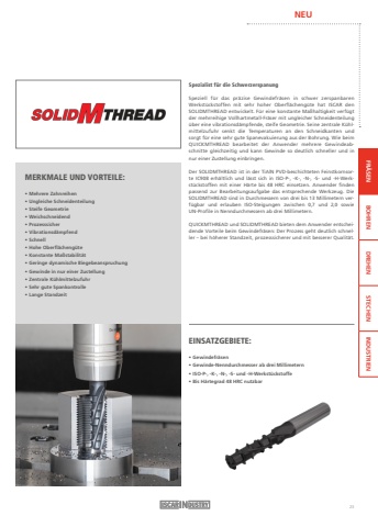 NEUFR%u00c4SEN BOHREN DREHEN STECHEN INDUSTRIENSpezialist f%u00fcr die SchwerzerspanungSpeziell f%u00fcr das pr%u00e4zise Gewindefr%u00e4sen in schwer zerspanbaren Werkst%u00fcckstoffen mit sehr hoher Oberfl%u00e4cheng%u00fcte hat ISCAR den SOLIDMTHREAD entwickelt. F%u00fcr eine konstante Ma%u00dfhaltigkeit verf%u00fcgt der mehrreihige Vollhartmetall-Fr%u00e4ser mit ungleicher Schneidenteilung %u00fcber eine vibrationsd%u00e4mpfende, steife Geometrie. Seine zentrale K%u00fchlmittelzufuhr senkt die Temperaturen an den Schneidkanten und sorgt f%u00fcr eine sehr gute Spanevakuierung aus der Bohrung. Wie beim QUICKMTHREAD bearbeitet der Anwender mehrere Gewindeabschnitte gleichzeitig und kann Gewinde so deutlich schneller und in nur einer Zustellung einbringen.Der SOLIDMTHREAD ist in der TiAlN PVD-beschichteten Feinstkornsorte IC908 erh%u00e4ltlich und l%u00e4sst sich in ISO-P-, -K-, -N-, -S- und -H-Werkst%u00fcckstoffen mit einer H%u00e4rte bis 48 HRC einsetzen. Anwender finden passend zur Bearbeitungsaufgabe das entsprechende Werkzeug. Die SOLIDMTHREAD sind in Durchmessern von drei bis 13 Millimetern verf%u00fcgbar und erlauben ISO-Steigungen zwischen 0,7 und 2,0 sowie UN-Profile in Nenndurchmessern ab drei Millimetern.QUICKMTHREAD und SOLIDMTHREAD bieten dem Anwender entscheidende Vorteile beim Gewindefr%u00e4sen: Der Prozess geht deutlich schneller %u2013 bei h%u00f6herer Standzeit, prozesssicherer und mit besserer Qualit%u00e4t.MERKMALE UND VORTEILE:%u2022 Mehrere Zahnreihen %u2022 Ungleiche Schneidenteilung %u2022 Steife Geometrie%u2022 Weichschneidend%u2022 Prozesssicher%u2022 Vibrationsd%u00e4mpfend%u2022 Schnell%u2022 Hohe Oberfl%u00e4cheng%u00fcte%u2022 Konstante Ma%u00dfstabilit%u00e4t %u2022 Geringe dynamische Biegebeanspruchung%u2022 Gewinde in nur einer Zustellung%u2022 Zentrale K%u00fchlmittelzufuhr%u2022 Sehr gute Spankontrolle%u2022 Lange StandzeitEINSATZGEBIETE:%u2022 Gewindefr%u00e4sen%u2022 Gewinde-Nenndurchmesser ab drei Millimetern%u2022 ISO-P-, -K-, -N-, -S- und -H-Werkst%u00fcckstoffe%u2022 Bis H%u00e4rtegrad 48 HRC nutzbar23