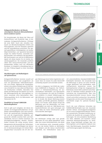 TECHNOLOGIEFR%u00c4SEN BOHREN DREHEN STECHEN INDUSTRIENEinlippentieflochbohrer mit Wendeschneidplatte: Maximale Wirtschaftlichkeit durch modulares SystemF%u00fcr Anwendungen, bei denen der Fokus auf Kosteneffizienz und Flexibilit%u00e4t liegt, ist der modulare Einlippentieflochbohrer (TriDeep) die erste Wahl. Durch den schnellen Austausch von Wendeschneidplatten (TOGT) und F%u00fchrungsleisten wird die Standzeit optimiert und die Instandhaltung vereinfacht. Die speziell geschliffenen Schneidplatten mit breiter Wiper-Schlichtfase und Spanteiler-Geometrie sorgen f%u00fcr stabile Prozesse, vermeiden Aufbauschneiden und verbessern die Spanabfuhr.Mit Durchmessern von acht bis 32 Millimetern eignet sich dieses System f%u00fcr ein breites Anwendungsspektrum. Der Anwender profitiert neben dem ressourcenschonenden und kostensparenden Aufbau auch von effizienten Prozessen. Im Vergleich zu BrazeDeep kann er mit dem TriDeep doppelt so hohe Vorsch%u00fcbe fahren.Oberfl%u00e4cheng%u00fcte und Ma%u00dfhaltigkeit auf SpitzenniveauEinlippentieflochbohrer kommen sowohl auf Bearbeitungszentren und Langdrehern als auch auf spezialisierten Tieflochbohrmaschinen zum Einsatz. W%u00e4hrend bei Standardmaschinen eine pr%u00e4zise Pilotbohrung mit H8-Toleranz erforderlich ist, kann diese auf Maschinen mit Bohrbuchsen entfallen. Besonders hier spielen die Werkzeuge ihre St%u00e4rken aus: Durch die Gl%u00e4ttungswirkung der F%u00fchrungsfasen erzielen Anwender ohne Nacharbeiten Oberfl%u00e4chenqualit%u00e4ten bis Ra 0,4 Mikrometer und Toleranzen bis IT5.Flexibilit%u00e4t ist Trumpf: SUMOGUNWechselkopfbohrerDoch es gibt auch Aufgaben, bei denen Anwender mit Einlippentieflochbohrern mit gel%u00f6teten Hartmetallk%u00f6pfen nicht weit kommen.Durch die asymmetrische Schneiden-Geometrie und die eingeschr%u00e4nkte Stabilit%u00e4t, aufgrund der L%u00f6tstelle zwischen Rohr und Hartmetallkopf, sind sie in Sachen Vorschub- und Schnittgeschwindigkeiten deutlich limitiert.Zudem schr%u00e4nkt die mittig versetze Schneidengeometrie die Koaxialit%u00e4t der Tieflochbohrungen und die Zentrierf%u00e4higkeit der Bohrer ein. In Serienanwendungen mit hohem Werkzeugdurchlauf verursachen die oft sehr lanMit den neuen SUMOGUN-Tieflochbohrern erzielen Anwender sehr hohe Oberfl%u00e4cheng%u00fcten und steigern ihre Produktivit%u00e4t.gen Werkzeuge einen hohen logistischen Aufwand. Denn sie m%u00fcssen f%u00fcr jeden Nachschliff aufw%u00e4ndig verpackt und versendet werden.Um dem zu begegnen, hat ISCAR den modularen SUMOGUN im Programm. Der Tieflochbohrer in Vollmaterialausf%u00fchrung mit auswechselbaren Bohrk%u00f6pfen und Spannh%u00fclsen ist in Durchmessern von zehn bis 25 Millimetern erh%u00e4ltlich. Er erlaubt Tiefbohrungen bis 400 Millimeter im Standard und 800 Millimeter im Sonder. Bei diesem Werkzeug kommt ein solider, auf 48 HRC geh%u00e4rteter, Stahlbohrk%u00f6rper zum Einsatz. Dank diesem bringt das Werkzeug auch bei Werkstoffen mit einer Zugfestigkeit von mehr als 1.000 Newton pro Quadratmillimeter sehr gute Leistungen und kann selbst bei hohen Schnittwerten gro%u00dfe Torsionskr%u00e4fte %u00fcbertragen.Doppelt modulares SystemDer Bohrk%u00f6rper verf%u00fcgt %u00fcber zwei gerade Spannuten f%u00fcr eine ideale Spanabfuhr sowie %u00fcber eine innere K%u00fchlmittelzufuhr, die direkt in der Schnittzone wirkt. Anwender profitieren von der breiten Palette an Bohrk%u00f6pfen und -k%u00f6rpern und der daraus resultierenden Flexibilit%u00e4t. Die Tieflochbohrer lassen sichDurch die zwei effektiven Schneiden der SUMOCHAM-Bohrk%u00f6pfe kann der Anwender deutlich h%u00f6here Vorschubgeschwindigkeit als mit einem Einlippentieflochbohrer fahren.mit unterschiedlichen Standard-SUMOCHAMBohrk%u00f6pfen best%u00fccken. Der Anwender kann die Werkzeuge so genau auf seine Anforderungen abstimmen und verschiedene, werkstoffoptimierte Geometrien nutzen. Der Bohrkopfwechsel erfolgt bei eingespanntem Bohrk%u00f6rper. Damit fallen praktisch keine R%u00fcstzeiten an. Ebenfalls modular gestaltet ist die Aufnahme der Einspannh%u00fclsen: %u00dcber eine Gewindeschnittstelle k%u00f6nnen Nutzer diese schnell und einfach austauschen. Das spezielle Feingewinde und die axiale Plananlage in der Schnittstelle sorgen f%u00fcr optimale Rundlaufwerte.Durch die zwei effektiven Schneiden der SUMOCHAM-Bohrk%u00f6pfe kann der Anwender deutlich h%u00f6here Vorschubgeschwindigkeiten als mit einem Einlippentieflochbohrer fahren.Die symmetrische Schneiden-Ausf%u00fchrung unterst%u00fctzt die Qualit%u00e4t der erzeugten Tieflochbohrungen. F%u00fcr eine produktive Bearbeitung von Stahl, Edelstahl und Gusseisen stehen optimierte Bohrkopf-Geometrien zur Verf%u00fcgung. Einige Bohrk%u00f6pfe verf%u00fcgen %u00fcber vier F%u00fchrungsfasen und erm%u00f6glichen dadurch eine hohe Oberfl%u00e4cheng%u00fcte, Koaxialit%u00e4t, Rundheit und Positionsgenauigkeit der Bohrung.31