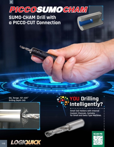 SCAN MEYOU DrillingIntelligently?SUMO-CHAM Drill with a PICCO-CUT Connection Small 3xD Holders with Internal Coolant Channels. Suitable for Small and Swiss Type Machines.Dia. Range: .157-.429%u201dDrilling Depth 3XD110HOLEMAKING