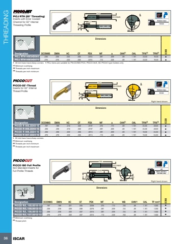 THREADING36 ISCAR Xax55%u00b0CFWFLU PDXDCONMSOALPDXHCB.S.84Medium classDimensionsDesignation DCONMS DMIN HC CF PDX WF a OHN(1) OAL TPIX(2) TPIN(3) IC908PICJ RTH14W24D060 .236 .236 .032 .005 .0315 .091 .209 .59 1.181 24.00 16.00 %u2022 PICJ RTH14W24D070 .276 .276 .032 .005 .0315 .110 .248 .59 1.181 24.00 16.00 %u2022 %u2022 All mini-bars have sharp corners %u2022 PICJ items are suitable for PICCO/MG PCO, PICCO ACE, SC-PICCO type holders only(1) Minimum overhang (2) Threads per inch maximum (3) Threads per inch minimum PICJ RTH (55%u00b0 Threading)Inserts with Inner Coolant Channel for 55%u00b0 Internal Threading Profile55%u00b0NUTSCREW Xax55%u00b0CFWFOHNPDXDCONMSOALPDXHCRight-hand shownB.S.84Medium classDimensionsDesignation DCONMS DMIN HC CF PDX WF a OHN(1) OAL TPIN(2) TPIX(3) IC228PICCO R 005.5548-15 .197 .189 .016 .002 .0197 .075 .173 .59 1.181 24.00 48.00 %u2022 PICCO R 006.5548-15 .236 .236 .016 .002 .0197 .091 .209 .59 1.181 24.00 48.00 %u2022 PICCO R 006.5524-15 .236 .236 .032 .005 .0315 .091 .209 .59 1.181 16.00 24.00 %u2022 PICCO R 007.5524-15 .276 .276 .032 .005 .0315 .110 .248 .59 1.181 16.00 24.00 %u2022 %u2022 All mini-bars have sharp corners (1) Minimum overhang (2) Threads per inch minimum (3) Threads per inch maximum PICCO-55%u00b0-ThreadInserts for 55%u00b0 Internal Thread Profile55%u00b0NUTSCREW XWBaX60%u00b0CFWFOHN PDXDCONMSOALPDXHCRight-hand shownDIN13, ISO 68-1,ISO 965 (1&2)6HDimensionsDesignation DCONMS DMIN HC CF PDX WF a WB OHN(1) OAL TP mm(2) IC908PICCO R/L 105.0510-15 .197 .189 .021 .005 .0236 .075 .173 .130 .59 1.181 1.000 %u2022 PICCO R/L 106.0612-15 .236 .236 .026 .006 .0276 .091 .209 .134 .59 1.181 1.250 %u2022 PICCO R/L 106.0815-15 .236 .236 .032 .007 .0315 .091 .209 .134 .59 1.181 1.500 %u2022 PICCO R/L 107.0815-15 .276 .276 .032 .007 .0315 .110 .248 .150 .59 1.181 1.500 %u2022 (1) Minimum overhang (2) Thread pitch PICCO ISO Full ProfileISO Standard Inserts for Full Profile Threads60%u00b0 1/4 TP1/8 TPNUTSCREW