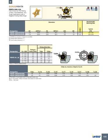 %u00d8.945 %u00b1.0016CW RECDXBWDimensions Recommended Machining DataDesignation CW CWTOL(1) RE RETOL(2) CDX BW IC808Gf groove(IPR)PENTA 24N200C020SL .079 .00078 .0079 .0012 .236 .157 %u2022 .0020-.0063PENTA 24N300C020SL .118 .00078 .0079 .0012 .244 .157 %u2022 .0024-.0079%u2022 CUTDIA as a function of depth of cut (CDX). (1) Cutting width tolerance (+/-) (2) Corner radius tolerance (+/-) T-MaxD-Max As a Function of Depth of Cut (T)Designation T%u2264.118 T%u2264.138 T%u2264.157 T%u2264.177 T%u2264.197 T%u2264.217 T%u2264.236 T%u2264.244PENTA 24N200C020SL .236 N.L. 18.504 8.268 4.724 2.953 1.772 .787 -PENTA 24N300C020SL .244 N.L. 18.504 8.268 4.724 2.953 2.362 1.575 .787%u00d8 D-Max%u00d8 D-MaxT-MaxParting Hollow BarsDesignation W %u00b1 .0008Parting to Center D-Max T-Max D-MaxPENTA 24...SLW = 0.197 .197 .098* 9.843W = .0394 .276 .138 9.843W = .0591 .394 .197 1.181W = .0787 .472 .236 .787W = .0972 .394 .197 1.181W = .1181 .488 .244 .787*Refers to PENTA 24N050J004SL(1) The data in those tables refers to standard inserts only.(2) As T decreases ,D-Max Increases. See tables for further data.(3) N.L. = No Limit.PENTA 24N-C-SLFirst Choice for The Parting of Bars, Hard Materials, and Tough Applications with a Negative Cutting Rake Angle103