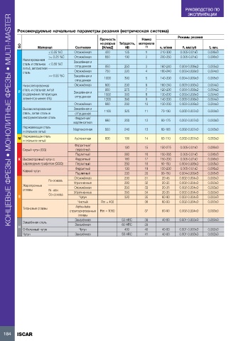 Рекомендуемые начальные параметры резания (метрическая система)