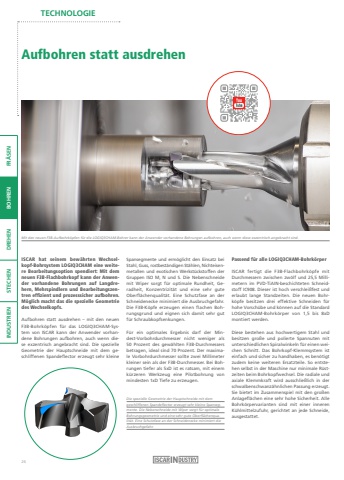 TECHNOLOGIEFR%u00c4SEN BOHREN DREHEN STECHEN INDUSTRIENAufbohren statt ausdrehenDie spezielle Geometrie der Hauptschneide mit dem geschliffenen Spandeflector erzeugt sehr kleine Spansegmente. Die Nebenschneide mit Wiper sorgt f%u00fcr optimale Bohrungsgeometrie und eine sehr gute Oberfl%u00e4chenqualit%u00e4t. Eine Schutzfase an der Schneidenecke minimiert die Ausbruchgefahr.ISCAR hat seinem bew%u00e4hrten Wechselkopf-Bohrsystem LOGIQ3CHAM eine weitere Bearbeitungsoption spendiert: Mit dem neuen F3B-Flachbohrkopf kann der Anwender vorhandene Bohrungen auf Langdrehern, Mehrspindlern und Bearbeitungszentren effizient und prozesssicher aufbohren. M%u00f6glich macht das die spezielle Geometrie des Wechselkopfs.Aufbohren statt ausdrehen %u2013 mit den neuen F3B-Bohrk%u00f6pfen f%u00fcr das LOGIQ3CHAM-System von ISCAR kann der Anwender vorhandene Bohrungen aufbohren, auch wenn diese exzentrisch angebracht sind. Die spezielle Geometrie der Hauptschneide mit dem geschliffenen Spandeflector erzeugt sehr kleine Mit den neuen F3B-Aufbohrk%u00f6pfen f%u00fcr die LOGIQ3CHAM-Bohrer kann der Anwender vorhandene Bohrungen aufbohren, auch wenn diese exzentrisch angebracht sind.Spansegmente und erm%u00f6glicht den Einsatz bei Stahl, Guss, rostbest%u00e4ndigen St%u00e4hlen, Nichteisenmetallen und exotischen Werkst%u00fcckstoffen der Gruppen ISO M, N und S. Die Nebenschneide mit Wiper sorgt f%u00fcr optimale Rundheit, Geradheit, Konzentrizit%u00e4t und eine sehr gute Oberfl%u00e4chenqualit%u00e4t. Eine Schutzfase an der Schneidenecke minimiert die Ausbruchgefahr.Die F3B-K%u00f6pfe erzeugen einen flachen Bohrungsgrund und eignen sich damit sehr gut f%u00fcr Schraubkopfsenkungen.F%u00fcr ein optimales Ergebnis darf der Mindest-Vorbohrdurchmesser nicht weniger als 50 Prozent des gew%u00e4hlten F3B-Durchmessers betragen, ideal sind 70 Prozent. Der maximale Vorbohrdurchmesser sollte zwei Millimeter kleiner sein als der F3B-Durchmesser. Bei Bohrungen tiefer als 5xD ist es ratsam, mit einem k%u00fcrzeren Werkzeug eine Pilotbohrung von mindesten 1xD Tiefe zu erzeugen.Passend f%u00fcr alle LOGIQ3CHAM-Bohrk%u00f6rperISCAR fertigt die F3B-Flachbohrk%u00f6pfe mit Durchmessern zwischen zw%u00f6lf und 25,5 Millimetern im PVD-TiAIN-beschichteten Schneidstoff IC908. Dieser ist hoch verschlei%u00dffest und erlaubt lange Standzeiten. Die neuen Bohrk%u00f6pfe besitzen drei effektive Schneiden f%u00fcr hohe Vorsch%u00fcbe und k%u00f6nnen auf die Standard LOGIQ3CHAM-Bohrk%u00f6rper von 1,5 bis 8xD montiert werden.Diese bestehen aus hochwertigem Stahl und besitzen gro%u00dfe und polierte Spannuten mit unterschiedlichen Spiralwinkeln f%u00fcr einen weichen Schnitt. Das Bohrkopf-Klemmsystem ist einfach und sicher zu handhaben, es ben%u00f6tigt zudem keine weiteren Ersatzteile. So entstehen selbst in der Maschine nur minimale R%u00fcstzeiten beim Bohrkopfwechsel. Die radiale und axiale Klemmkraft wird ausschlie%u00dflich in der schwalbenschwanz%u00e4hnlichen Passung erzeugt.Sie bietet im Zusammenspiel mit den gro%u00dfen Anlagefl%u00e4chen eine sehr hohe Sicherheit. Alle Bohrk%u00f6rpervarianten sind mit einer inneren K%u00fchlmittelzufuhr, gerichtet an jede Schneide, ausgestattet.26