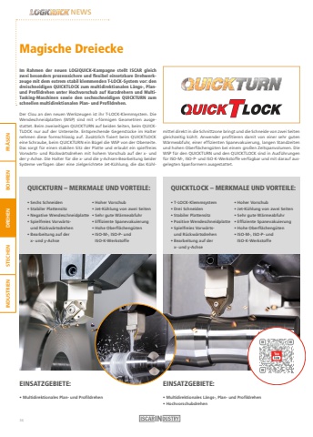 FR%u00c4SEN BOHREN DREHEN STECHEN INDUSTRIENNEWSMagische DreieckeIm Rahmen der neuen LOGIQUICK-Kampagne stellt ISCAR gleich zwei besonders prozesssichere und flexibel einsetzbare Drehwerkzeuge mit dem extrem stabil klemmenden T-LOCK-System vor: den dreischneidigen QUICKTLOCK zum multidirektionalen L%u00e4ngs-, Planund Profildrehen unter Hochvorschub auf Kurzdrehern und MultiTasking-Maschinen sowie den sechsschneidigen QUICKTURN zum schnellen multidirektionalen Plan- und Profildrehen. Der Clou an den neuen Werkzeugen ist ihr T-LOCK-Klemmsystem. Die Wendeschneidplatten (WSP) sind mit v-f%u00f6rmigen Geometrien ausgestattet. Beim zweiseitigen QUICKTURN auf beiden Seiten, beim QUICKTLOCK nur auf der Unterseite. Entsprechende Gegenst%u00fccke im Halter nehmen diese formschl%u00fcssig auf. Zus%u00e4tzlich fixiert beim QUICKTLOCK eine Schraube, beim QUICKTURN ein B%u00fcgel die WSP von der Oberseite.Das sorgt f%u00fcr einen stabilen Sitz der Platte und erlaubt ein spielfreies Vorw%u00e4rts- und R%u00fcckw%u00e4rtsdrehen mit hohem Vorschub auf der x- und der y-Achse. Die Halter f%u00fcr die x- und die y-Achsen-Bearbeitung beider Systeme verf%u00fcgen %u00fcber eine zielgerichtete Jet-K%u00fchlung, die das K%u00fchlEINSATZGEBIETE:%u2022 Multidirektionales Plan- und ProfildrehenQUICKTURN %u2013 MERKMALE UND VORTEILE:%u2022 Sechs Schneiden%u2022 Stabiler Plattensitz %u2022 Negative Wendeschneidplatte%u2022 Spielfreies Vorw%u00e4rtsund R%u00fcckw%u00e4rtsdrehen%u2022 Bearbeitung auf der x- und y-Achsemittel direkt in die Schnittzone bringt und die Schneide von zwei Seiten gleichzeitig k%u00fchlt. Anwender profitieren damit von einer sehr guten W%u00e4rmeabfuhr, einer effizienten Spanevakuierung, langen Standzeiten und hohen Oberfl%u00e4cheng%u00fcten bei einem gro%u00dfen Zeitspanvolumen. Die WSP f%u00fcr den QUICKTURN und den QUICKTLOCK sind in Ausf%u00fchrungen f%u00fcr ISO-M-, ISO-P- und ISO-K-Werkstoffe verf%u00fcgbar und mit darauf ausgelegten Spanformern ausgestattet.%u2022 Hoher Vorschub%u2022 Jet-K%u00fchlung von zwei Seiten%u2022 Sehr gute W%u00e4rmeabfuhr%u2022 Effiziente Spanevakuierung%u2022 Hohe Oberfl%u00e4cheng%u00fcten%u2022 ISO-M-, ISO-P- und ISO-K-WerkstoffeQUICKTLOCK %u2013 MERKMALE UND VORTEILE:%u2022 T-LOCK-Klemmsystem%u2022 Drei Schneiden%u2022 Stabiler Plattensitz%u2022 Positive Wendeschneidplatte%u2022 Spielfreies Vorw%u00e4rtsund R%u00fcckw%u00e4rtsdrehen%u2022 Bearbeitung auf der x- und y-Achse%u2022 Hoher Vorschub%u2022 Jet-K%u00fchlung von zwei Seiten%u2022 Sehr gute W%u00e4rmeabfuhr%u2022 Effiziente Spanevakuierung%u2022 Hohe Oberfl%u00e4cheng%u00fcten%u2022 ISO-M-, ISO-P- und ISO-K-WerkstoffeEINSATZGEBIETE:%u2022 Multidirektionales L%u00e4ngs-, Plan- und Profildrehen%u2022 Hochvorschubdrehen36