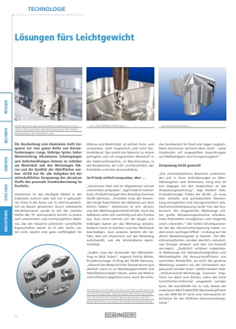 FR%u00c4SEN BOHREN DREHEN STECHEN INDUSTRIENTECHNOLOGIEL%u00f6sungen f%u00fcrs LeichtgewichtDie Bearbeitung vom Aluminium stellt Zerspaner vor eine ganze Reihe von Herausforderungen: Lange, klebrige Sp%u00e4ne, hoher W%u00e4rmeeintrag, Vibrationen, Schwingungen und Aufschwei%u00dfungen k%u00f6nnen zu Sch%u00e4den am Werkst%u00fcck und den Werkzeugen f%u00fchren und die Qualit%u00e4t der Oberfl%u00e4chen senken. ISCAR hat f%u00fcr alle Aufgaben bei der wirtschaftlichen Zerspanung des abrasiven Stoffs das passende Standardwerkzeug im Portfolio.Aluminium ist das h%u00e4ufigste Metall in der Erdkruste, kommt aber fast nur in gebundener Form in der Natur vor. Es wird haupts%u00e4chlich als Bauxit gewonnen. Durch verbesserte Herstellprozesse wurde es seit der zweiten H%u00e4lfte des 19. Jahrhunderts schnell zu einem weit verbreiteten und erschwinglichen Material, das der Industrie zahlreiche vorteilhafte Eigenschaften bietet: Es ist sehr leicht, rostet nicht, besitzt eine gute Leitf%u00e4higkeit f%u00fcr W%u00e4rme und Elektrizit%u00e4t, ist einfach form- und zerspanbar, nicht magnetisch und nicht funkenbildend. Das macht das Material zu einem gefragten und oft eingesetzten Werkstoff in der Elektronikindustrie, im Maschinenbau, in der Baubranche, der Luft- und Raumfahrt, der Eisenbahn und dem Automobilbau.Im Prinzip einfach zerspanbar, aber %u2026%u201eAluminium l%u00e4sst sich im Allgemeinen schnell und einfach zerspanen%u201c, sagt Frederik Schmalbach, Produktmanager Non-Rotating Tools bei ISCAR Germany. %u201eTrotzdem muss der Anwender einige Eigenheiten des Materials auf dem Schirm haben.%u201c Aluminium ist sehr abrasiv, was den Werkzeugverschlei%u00df erh%u00f6ht. Auch die Adh%u00e4sion wirkt sich nachteilig auf den Prozess aus. Zum einen k%u00f6nnen sich die langen und klebrigen Sp%u00e4ne um das Werkzeug wickeln.Dadurch kann es brechen und das Werkst%u00fcck besch%u00e4digen. Zum anderen besteht die Gefahr, dass sich Aluminium auf das Werkzeug aufschwei%u00dft, was die Schneidkante beeintr%u00e4chtigt.%u201eZudem muss der Anwender den W%u00e4rmeeintrag im Blick haben%u201c, erg%u00e4nzt Patrick Muller, Produktmanager Drilling bei ISCAR Germany.%u201eObwohl das Material hohe Temperaturen gut ableitet, kann es zu Werkzeugverschlei%u00df und Oberfl%u00e4chensch%u00e4den f%u00fchren, wenn die W%u00e4rme nicht effizient abgef%u00fchrt wird. Auch die einfache Formbarkeit ist Fluch und Segen zugleich.Denn Aluminium verformt eben leicht %u2013 unter Umst%u00e4nden mit ungewollten Auswirkungen auf Ma%u00dfhaltigkeit und Formgenauigkeit.%u201c Zerspanung leicht gemacht%u201eDie unterschiedlichen Branchen unterscheiden sich in ihren Anforderungen an Oberfl%u00e4cheng%u00fcten und Toleranzen, einig sind sie sich dagegen bei den Anspr%u00fcchen an das Zerspanungswerkzeug%u201c, sagt Herbert Volk, Produktmanager Fr%u00e4sen bei ISCAR. %u201eEs muss eine schnelle und prozesssichere Bearbeitung erm%u00f6glichen und l%u00f6sungsorientiert sein.Hochvolumenzerspanung lautet hier das Zauberwort. Die eingesetzten Werkzeuge sollten gro%u00dfe Zerspanungsvolumina erlauben, hohe Drehzahlen erm%u00f6glichen und m%u00f6glichst weich schneiden.%u201c Die hohen Schnittparameter bei der Aluminiumzerspanung haben zudem einen wichtigen Effekt %u2013 in Bezug auf die aktive Bearbeitungszeit je Bauteil. Die Maschinenlaufzeiten werden deutlich reduziert, was Energie einspart und den CO2-Aussto%u00df verringert. %u201eZus%u00e4tzlich erh%u00f6hen indexierbare Werkzeuge mit Wendeschneidplatten und Wechselk%u00f6pfen die Ressourceneffizienz von wertvollen Rohstoffen, da nicht das gesamte Werkzeug, sondern nur der Schneidsatz ausgetauscht werden muss%u201c, erkl%u00e4rt Herbert Volk.%u201eVollhartmetall-Werkzeuge kommen m%u00f6glichst nur dann zum Einsatz, wenn das hohe Schnitttiefen-Potential umgesetzt werden kann. Bei Schnitttiefe bis zu 1xD, bieten die modularen MULTI-MASTER-Wechselkopffr%u00e4ser aus der MM EA-CF Serie eine interessante Alternative f%u00fcr die effektive Aluminiumzerspanung.%u201cISCAR bietet f%u00fcr die wirtschaftliche Zerspanung von Alu- %u2026 den CHATTERFREE-VHM-Fr%u00e4ser, %u2026minium die passenden Standardwerkzeuge. Zum Fr%u00e4sen beispielsweise den HELI3MILL oder %u2026%u2026 die SUMOCHAM-Bohrer %u2026 Werkzeuge zum Drehen, Stechen und Fr%u00e4sen sind auch mit der Hard Carbon DLC- Nanokomposit-Beschichtung erh%u00e4ltlich. Sie erlaubt eine bessere Spanevakuierung und ihre glatte Oberfl%u00e4che verringert die Aufbauschneidenbildung.56
