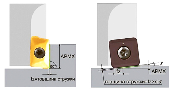 Рис. 1. Малі кути в плані у фрез FF дозволяють значно збільшити подачу на зуб (fz), витримуючи оптимальну товщину стружки